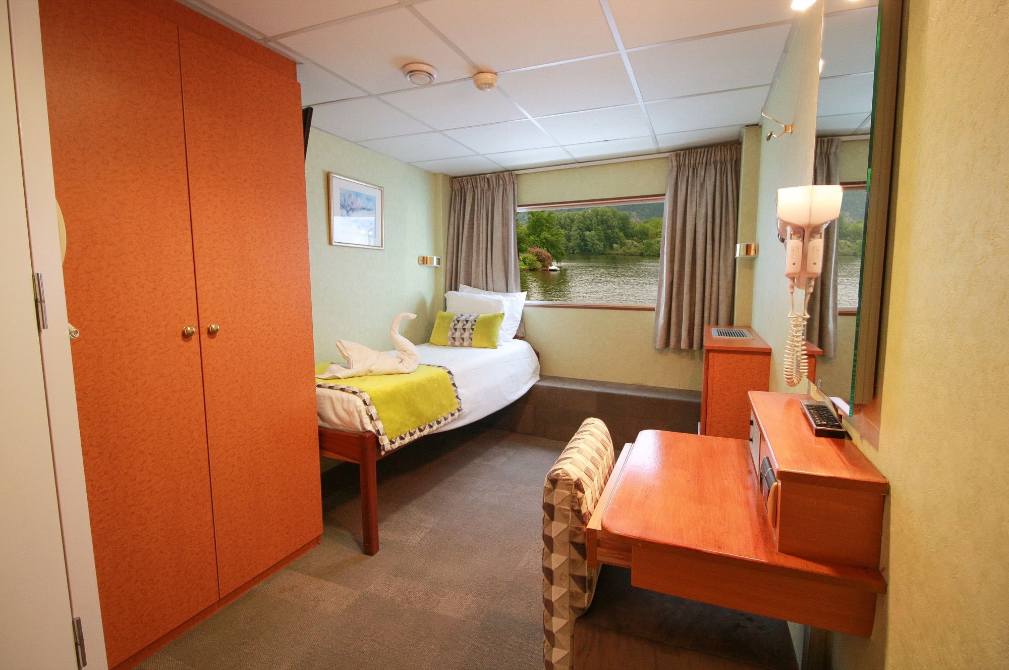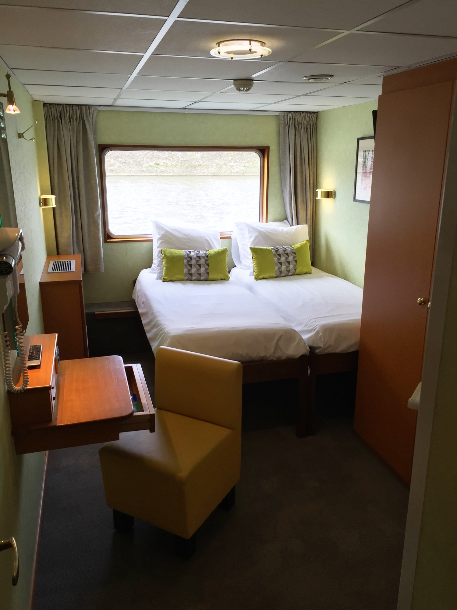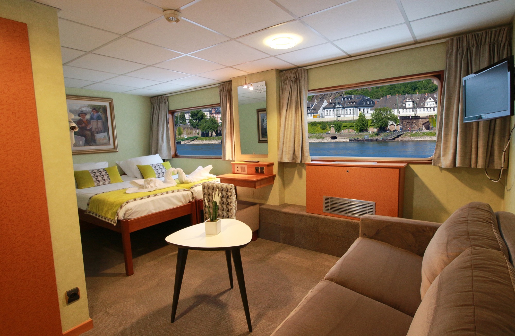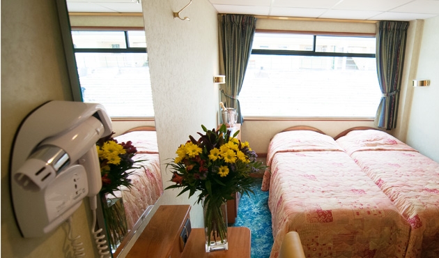 The lounge tastefully decorated, is located at the front of the ship and offers panoramic views. Cocktails and games, dancing, and other forms of entertainment all happen here.